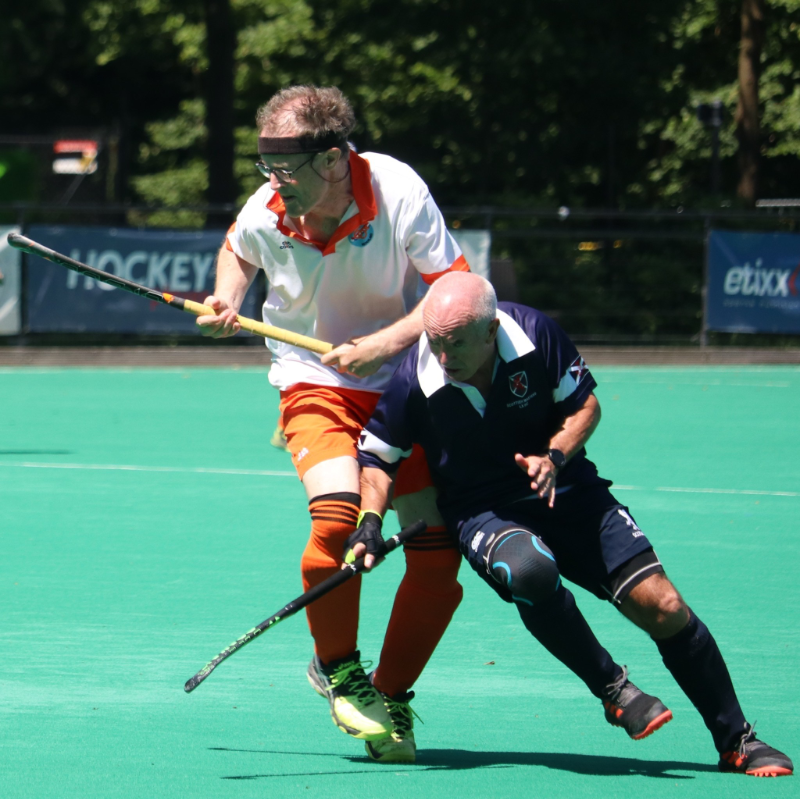 Scottish Thistles were desperately unlucky not to qualify for the final, losing out to Netherlands in a penalty shoot out after the match had finished level at 2-2. Thistles were in a strong frame of mind for this match. They anticipated the Dutch being skilled technically and providing a strong physical challenge. That’s exactly how the match turned out. The Dutch scored early on from a poorly taken short corner which was eventually turned in by Gijs Visser to give Netherlands an early lead. They could have doubled their lead when they were awarded a penalty stroke for a foot by Paul Docherty. However, Scott Chisholm in the Thistles goal made the save look comfortable. As the game progressed, the Scots applied more and more pressure on the Dutch defence who started to resort to some fierce tackling and jostling. Eventually their tactics resulted in a foul in their own circle and Paul Bateson converted the resulting flick with precision. The Dutch side held their nerve until Thistles were awarded a penalty flick late in the third quarter. Paul Bateson stepped up and put it away, levelling the scores at 1-1. Thistles then dominated the game but against the run of play the Dutch broke down their right and a crisp cross found Marius Van Huijstee who despatched the ball into the Scots’ net to put Netherlands ahead once again. Thistles maintained their high pace endeavours and when Iain Cameron was bundled over in the Dutch circle, Paul Bateson converted the resulting penalty flick to restore parity, and, with no further scoring, the match went to a penalty shoot out. Thistles went first in the penalty shoot out and Paul Bateson scored, while Netherlands failed to score, but Netherlands scored with their next three attempts and Scottish Thistles could convert only one of their remaining efforts, through Cliff Martin. The match was played on the main pitch with several hundred folk watching. At the end of the match their response was fantastic and it was obvious who they wanted to win! The contributions made by the midfield players of Paul Docherty (rightly awarded man of the match by the Dutch), John Lees, Rob Fisher, Stuart Stephen and Paul Bateson were astonishing. Scottish Thistles will now play off for the Bronze medal against Southern Cross, looking to avenge their loss to the Australians in the 2018 World Cup final.