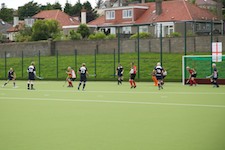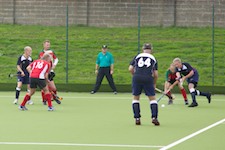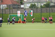 Loudon about to make a saving interception from Gangotra's cross with two Welsh players waiting to pounce