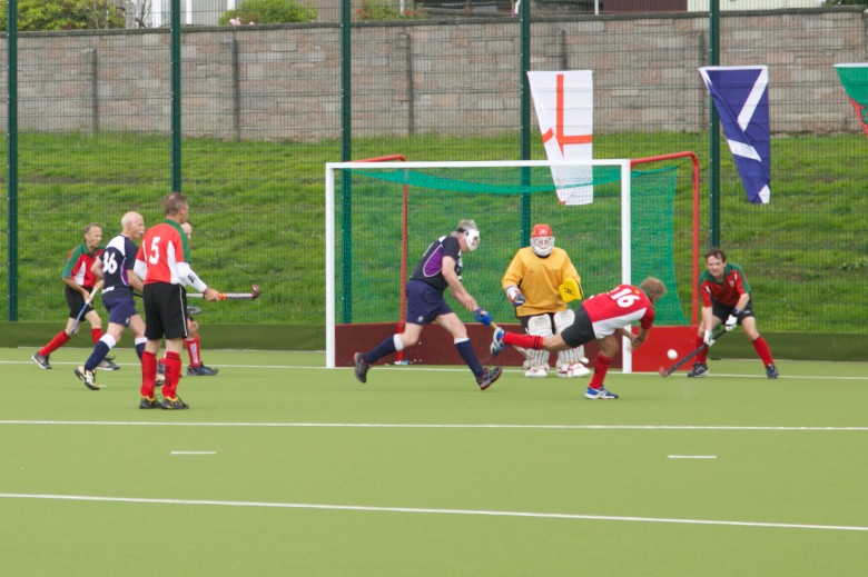 Caption: Brothers fires the ball towards goal at a penalty corner with Ben Johnson ready for a deflection …