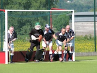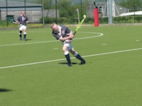 Ernie di Rollo once again leads out the Scottish defence at a short corner with the ball on its way to the striker