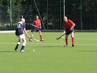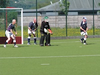 England captain Mike Surridge fires the ball towards goal as the opposing captain David Cassell closes in