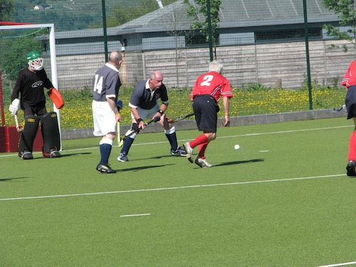 Caption: Scottish captain David Cassell keeps his eye on the ball with English forward Frank Hardy in close attendance